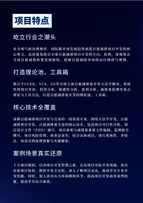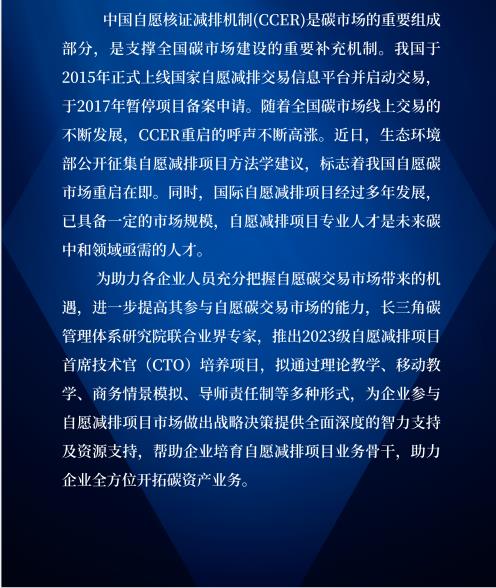 為助力各企業充分把握自愿碳交易市場帶來的機遇,進一步提高參與自愿碳交易市場的能力,長三角碳管理體系研究院聯合業界專家,推出2023級自愿減排項目首席技術官(CTO)培養項目,擬通過理論教學、移動教學、商務場景模擬、導師責任制等多種形式,幫助企業培育自愿減排項目業務骨干,助力企業全方位開拓碳資產業務。