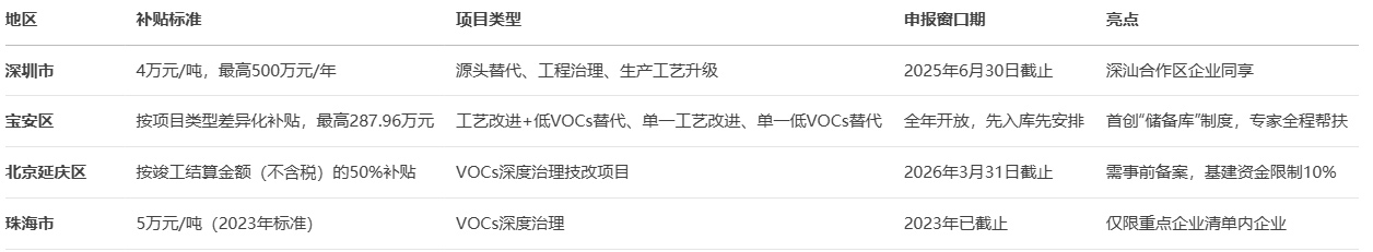 2025年3月,深圳市生態(tài)環(huán)境局與財政局聯(lián)合發(fā)布《關(guān)于開展工業(yè)源揮發(fā)性有機(jī)物(VOCs)減排項(xiàng)目補(bǔ)貼工作的通知》(深環(huán)〔2025〕45號),按4萬元/噸的標(biāo)準(zhǔn)對減排量進(jìn)行補(bǔ)貼,單個企業(yè)年度補(bǔ)貼上限達(dá)500萬元。