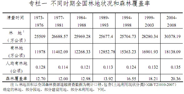 根據第七次全國森林資源清查(2004-2008 年)結果,全國林地總面積 30378.19萬公頃,占國土面積的 31.6%;森林覆蓋率 20.36%。林地中,有林地 18138.09萬公頃,灌木林地 5365.34萬公頃,疏林地 482.22萬公頃,未成林造林地 1132.63萬公頃,苗圃地 45.4 萬公頃,跡地(含采伐跡地和火燒跡地)709.61 萬公頃,宜林地 4403.54萬公頃,林業輔助用地 101.36萬公頃。