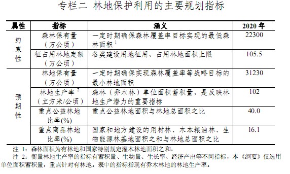 ——強化國家宏觀調控能力。根據各區林地保護利用方向、政策,綜合經濟社會發展水平、發展趨勢,資源環境條件,林地利用現狀和潛力等因素,分別確定各省(區、市)森林保有量、征占用林地定額等林地保護利用的約束性指標,以及林地保有量、林地生產率、重點公益林地比率、重點商品林地比率等預期性指標,強化國家對省級行政區域林地保護利用的調控。